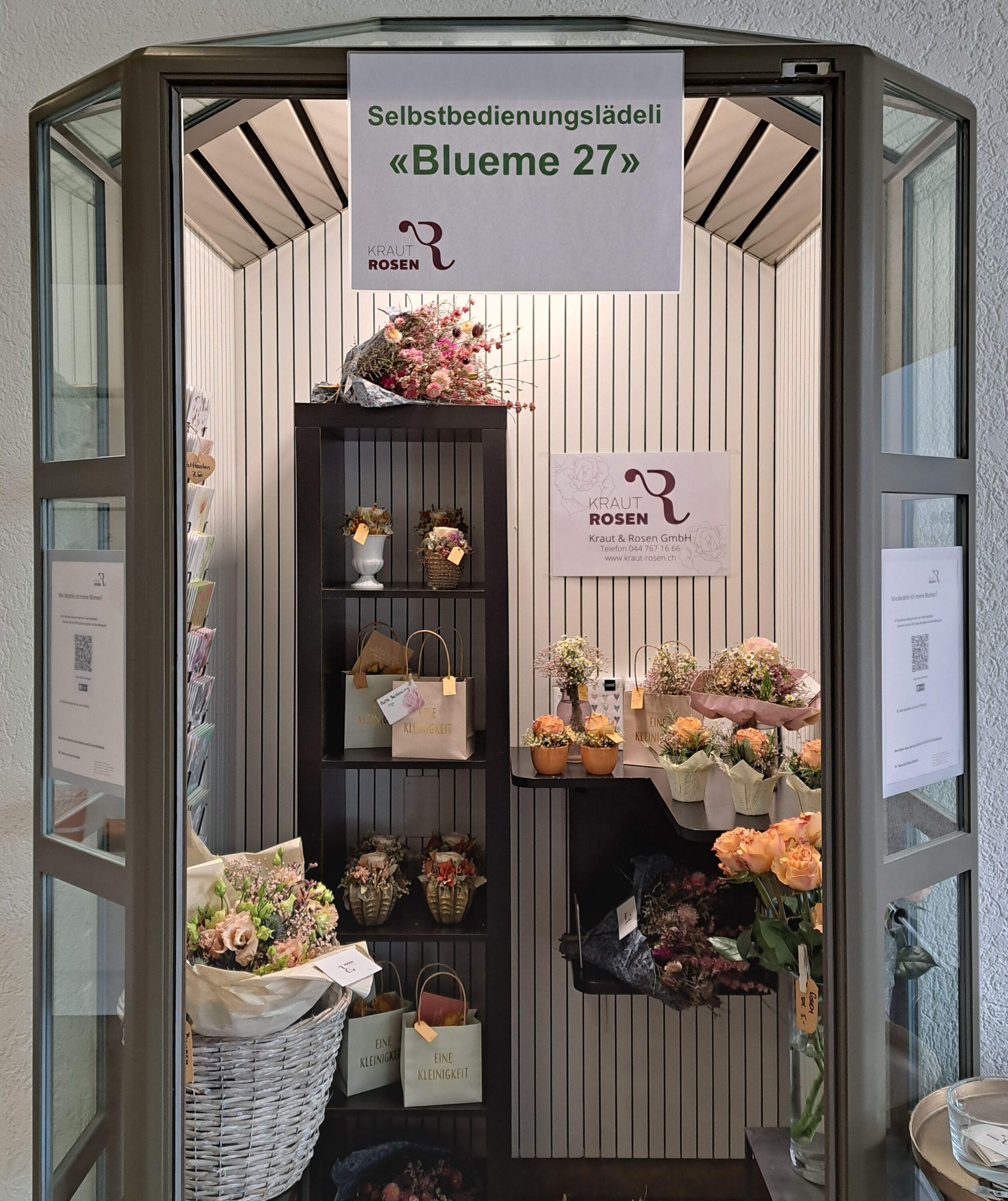 In Zusammenarbeit mit Kraut & Rosen aus Knonau finden Sie rechts beim Haupteingang das hübsche kleine Bluemelädeli "Blueme 27". Im Angebot sind saisonale Sträusse, Gestecke, blumige Mitbringsel und kleine Karten. Ideal, um unseren Patientinnen und Patienten eine kleine Freude zu bereiten. Sie können Ihre Auswahl mit TWINT oder bar beim Empfang bezahlen.
